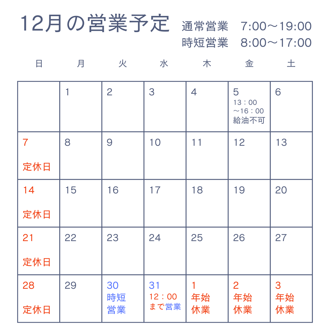 12/5(金)の13:00~16:00は設備検査のため、店頭での給油ができません。